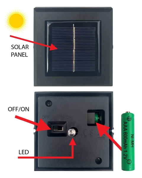 Na automatické zapnutie za súmraku stačí použiť voliteľný vypínač ON/OFF na vnútornej strane veka so solárnym panelom.