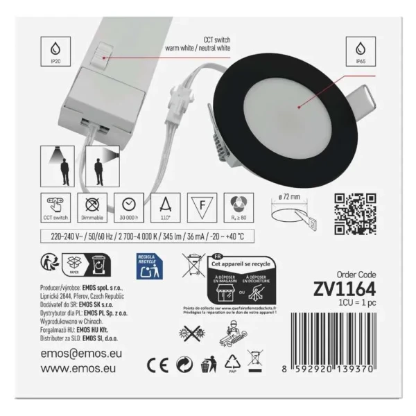 Podhľadové LED svietidlo EMOS ZV1164. Svietidlo je určené na montáž do sadrokartónu, dosiek a pod. Montáž je vhodná aj na horľavé povrchy "F".