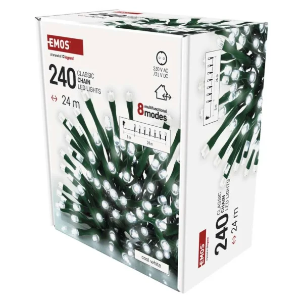 Vianočná LED reťazEMOS s LED v klasickom rozmere. Vhodná pre použitie vo vnútorných aj vonkajších priestoroch. Reťaz má 8 programov na striedanie rôznych druhov blikania.