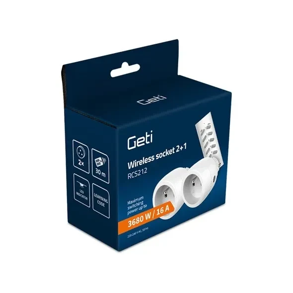 Zostava bezdrôtovo ovládaných zásuviek GETI RCS212 obsahuje diaľkový ovládač a 2x zásuvky 230V s prijímačom. Je určená na diaľkové zapínanie a vypínanie elektrických spotrebičov ako sú svetlá, televízory, počítače, vianočné osvetlenie a podobne. Najmä v miestach, kde nie je ľahký prístup napr. za skriňami, je toto riešenie ideálne. Pomocou diaľkového ovládača môžete zapínať a vypínať elektrické zariadenia cez nábytok aj múry. Pamätajte na to, že napriek rôznym prekážkam sa dosah zariadenia znižuje. Maximálna pripojená záťaž je 3680 W/16 A. Zásuvky možno ovládať tiež ručne tlačidlom.